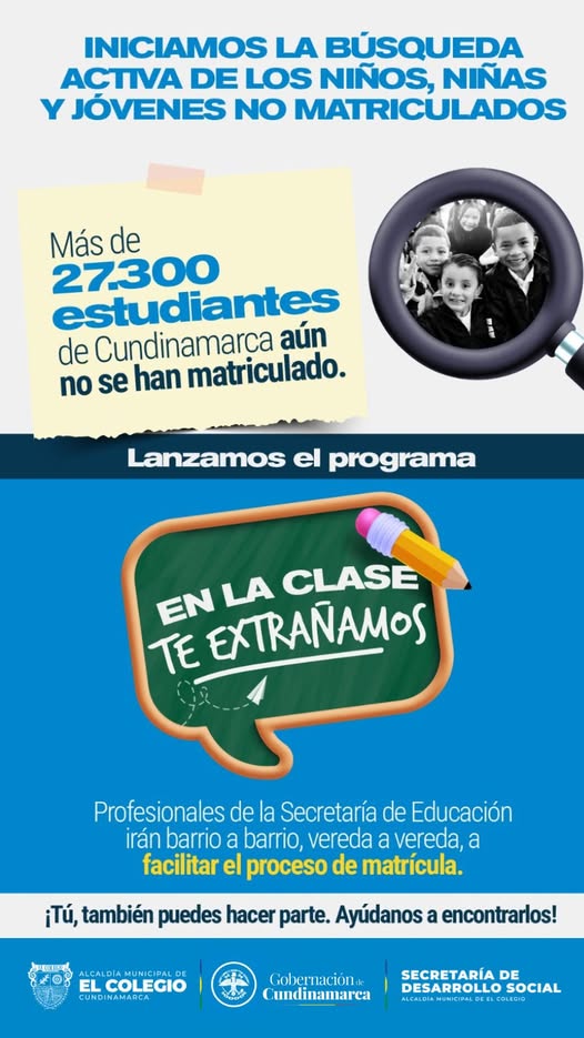Iniciamos la búsqueda activa de niños, niñas y jóvenes no matriculados, para acompañar y facilitar su regreso a las aulas, barrio a barrio y vereda a vereda. Esta labor se realiza con el respaldo de nuestro alcalde Diego López Suárez… Seguir leyendo →