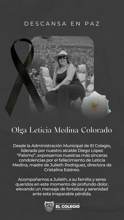 Desde la Administración Municipal de El Colegio, liderada por nuestro alcalde Diego López “Palomo”, acompañamos con respeto y sentimiento a Julieth Rodríguez, directora de Cristalina Estéreo, y a su familia, por el fallecimiento de Olga Leticia Medina Colorado. Elevamos un… Seguir leyendo →