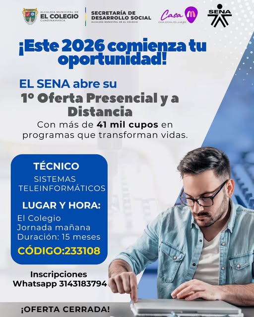 Este 2026 comienza tu oportunidad! con más de 41 mil cupos en programas que transforman vidas. Técnico en Sistemas Teleinformáticos Lugar: El Colegio Jornada: Mañana Duración: 15 meses Código: 233108 Inscripciones vía WhatsApp 314 318 3794 Una articulación con la… Seguir leyendo →