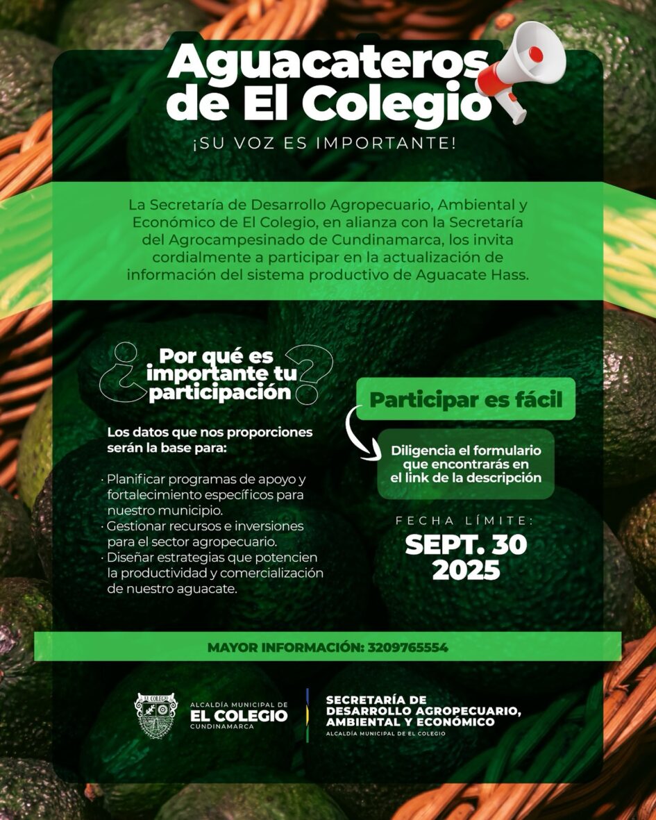 La Secretaría de Desarrollo Agropecuario, Ambiental y Económico, en alianza con la Secretaría del Agrocampesinado de Cundinamarca, te invita a participar en la actualización del sistema productivo de Aguacate Hass. Fecha límite: 30 de septiembre de 2025, Información: 320 9765554