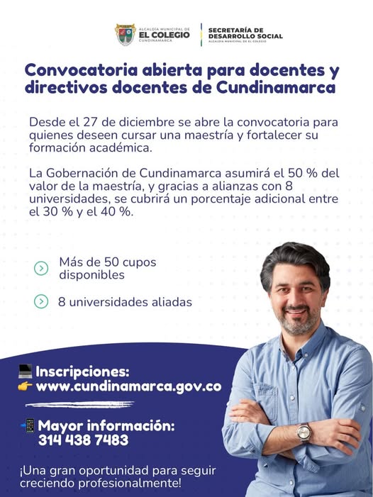 Gracias a la gestión de nuestro alcalde Diego López, se abre esta importante convocatoria dirigida a los docentes de El Colegio, para que puedan acceder a estudios de maestría y continuar fortaleciendo su formación académica ![]()