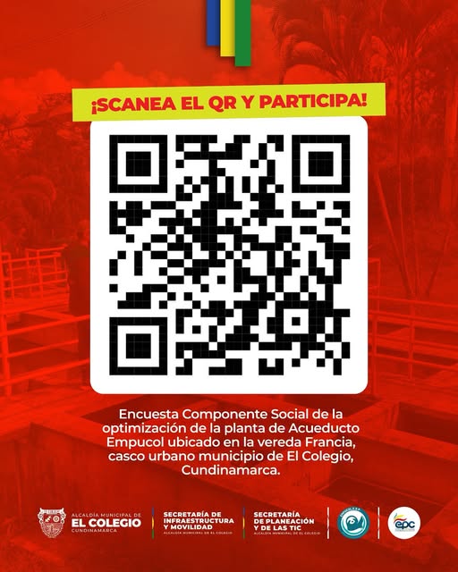Invitamos a la comunidad a participar en la Encuesta del Componente Social para la Optimización de la Planta de Acueducto de La Francia en el casco urbano de nuestro municipio El Colegio, Cundinamarca. Escanea el código QR o ingresa al… Seguir leyendo →